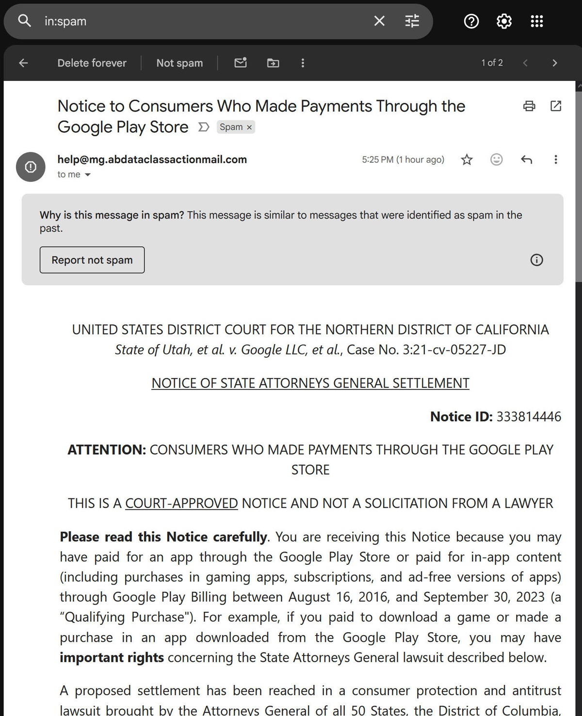 This is a completely real notice with absolutely none of the hallmarks of actual spam. The chances of this being a legitimate false positive are just about zero.